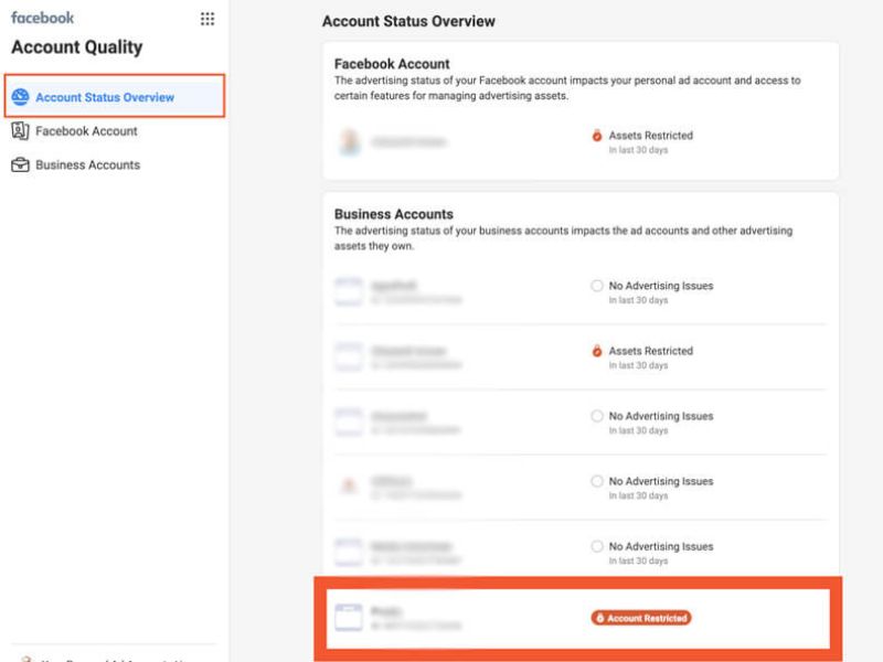 Step 2: In the Account Quality interface, click on Recent account issues. If the fanpage has advertising restrictions, it will display Account restricted.